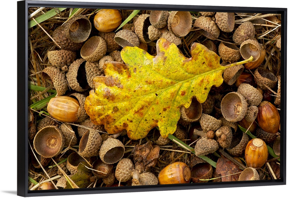 <p>Oak leaf and acorns on forest floor in autumn in England</p>