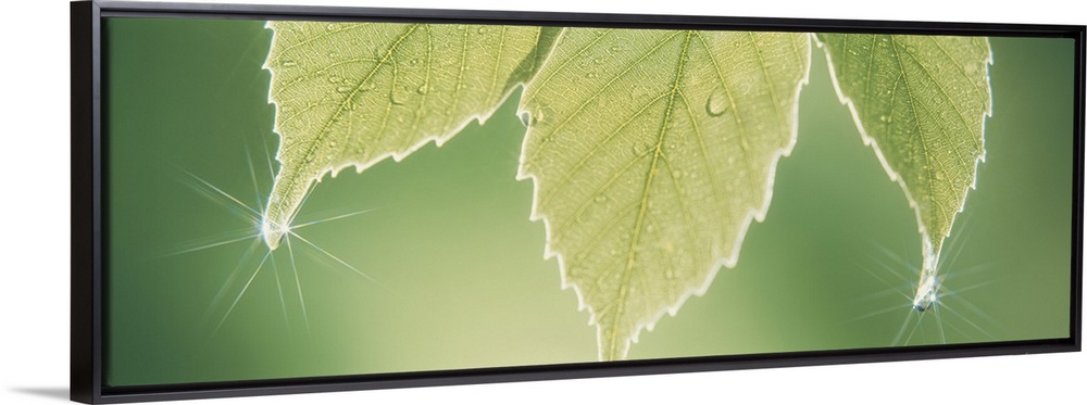 <p>Panoramic nature image of three green leafs hanging down with water drops creating sun starbursts on the tips of the leaf.</p>