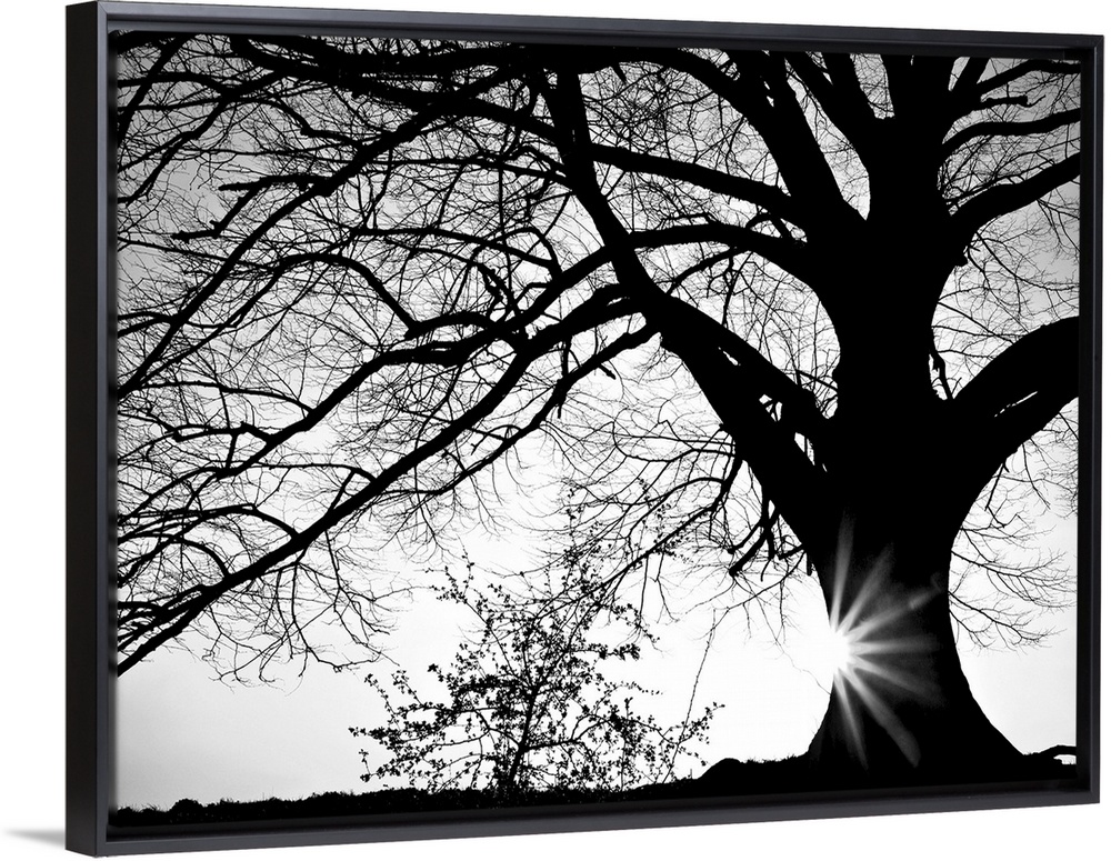<p>Black and white photograph of a large oak tree with the sun setting behind it.</p>