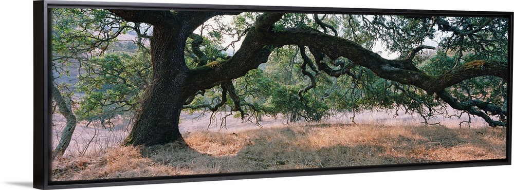 <p>Large panoramic of a large Oak tree with heavy limbs reaching down to the brown field below.</p>