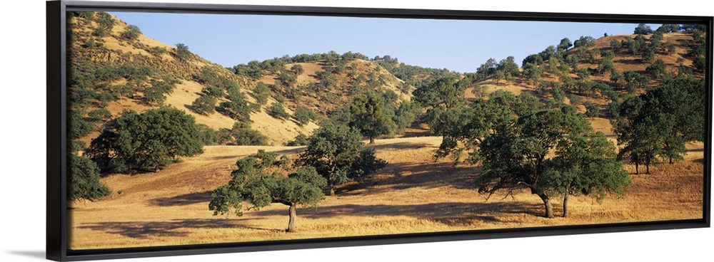 <p>Large oak trees are scattered throughout a dry field and on top of hills that are seen in the background.</p>