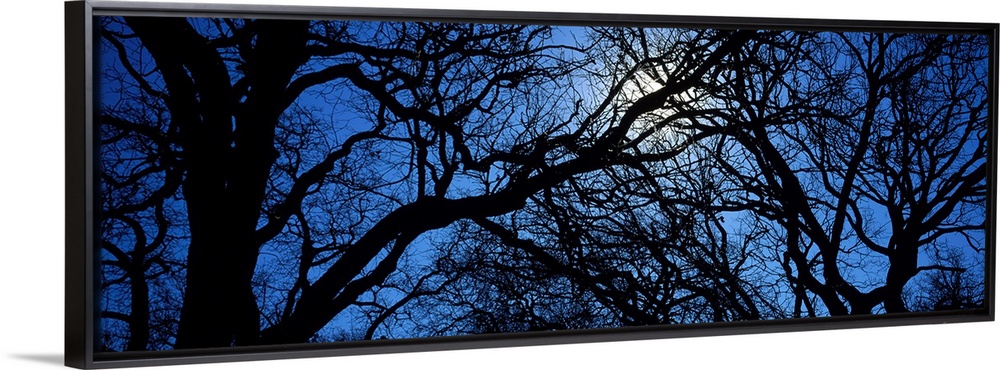 <p>Panoramic photograph looks through an abundant amount of thick and thin bare tree limbs to get a glimpse of the moon glowing in the nighttime sky.</p>