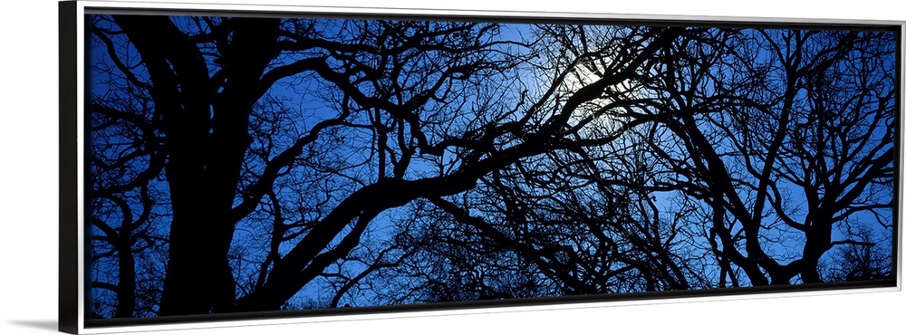 <p>Panoramic photograph looks through an abundant amount of thick and thin bare tree limbs to get a glimpse of the moon glowing in the nighttime sky.</p>