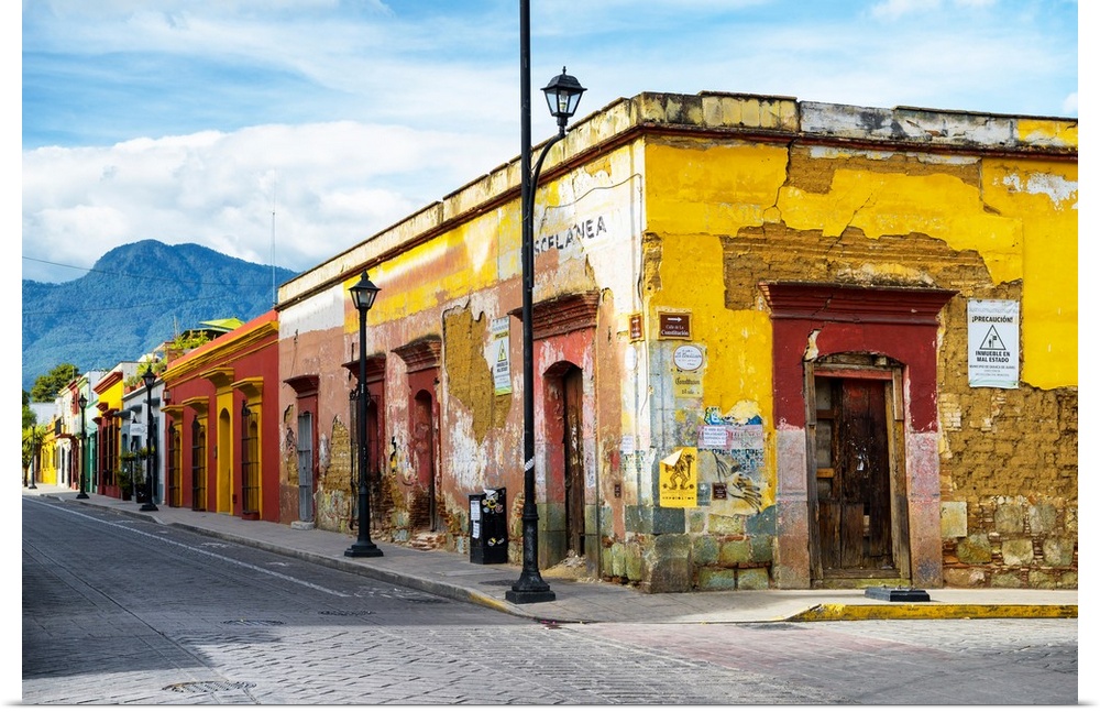 <p>Photograph of a bright city street in Oaxaca, Mexico, with a view of mountains in the background. From the Viva Mexico Collection.</p>