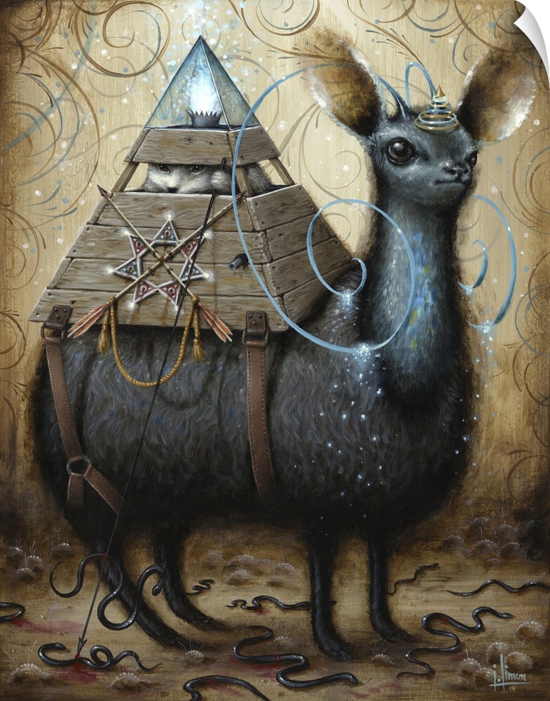 <p>Surrealist painting of a llama-type animal with pyramid shaped box on its back containing an animal.</p>