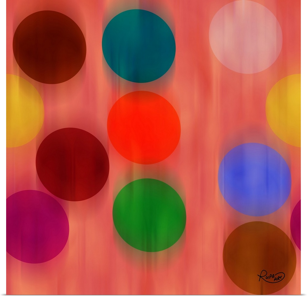 <p>Square abstract art with a pink background and faded falling circles in different colors.</p>