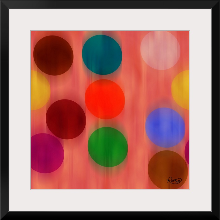 <p>Square abstract art with a pink background and faded falling circles in different colors.</p>