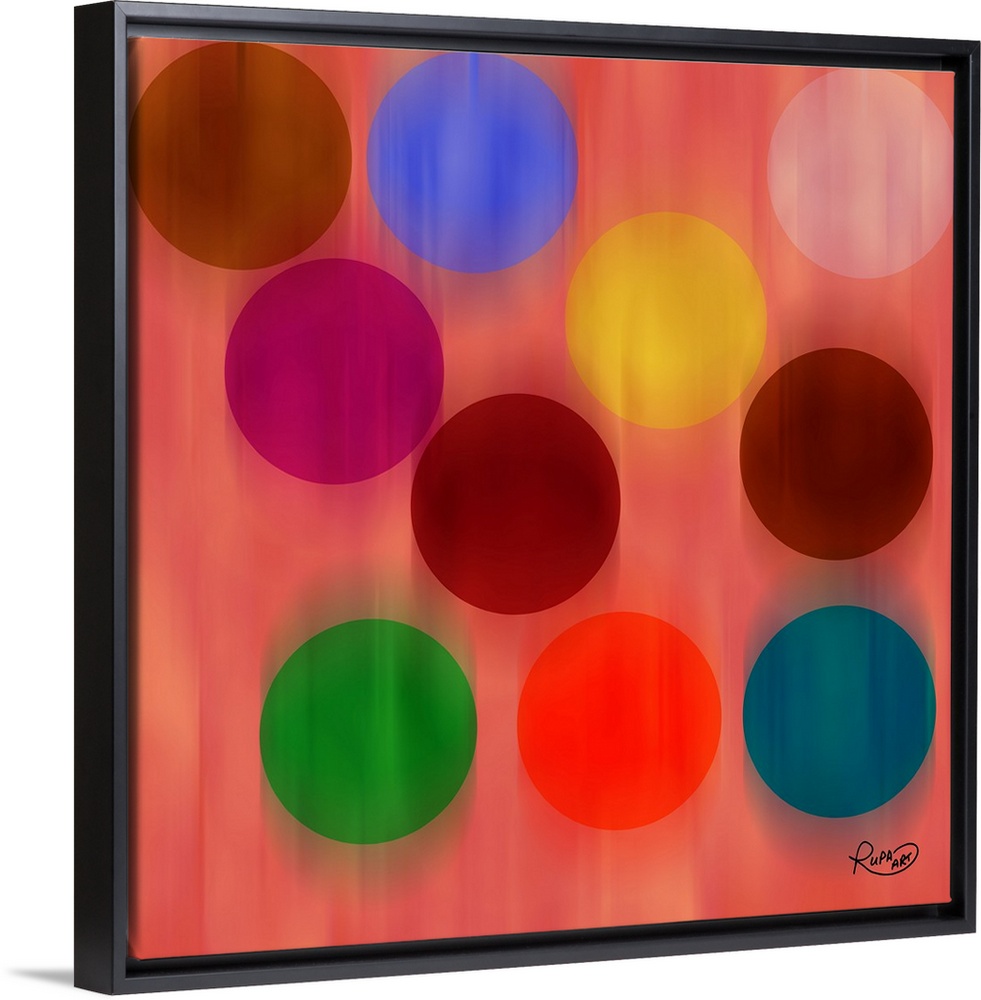 <p>Square abstract art with a pink background and faded falling circles in different colors.</p>