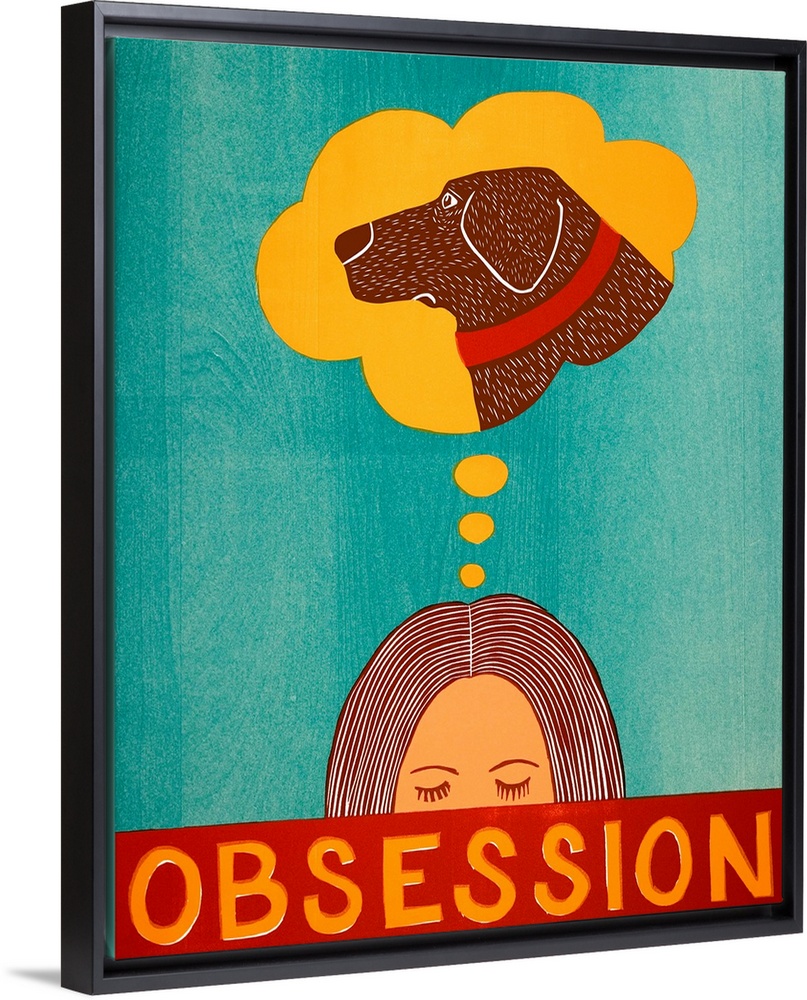 <p>Illustration of a woman with a thought bubble above her head that has a picture of her chocolate lab with the word "Obsession" written on the bottom.</p>