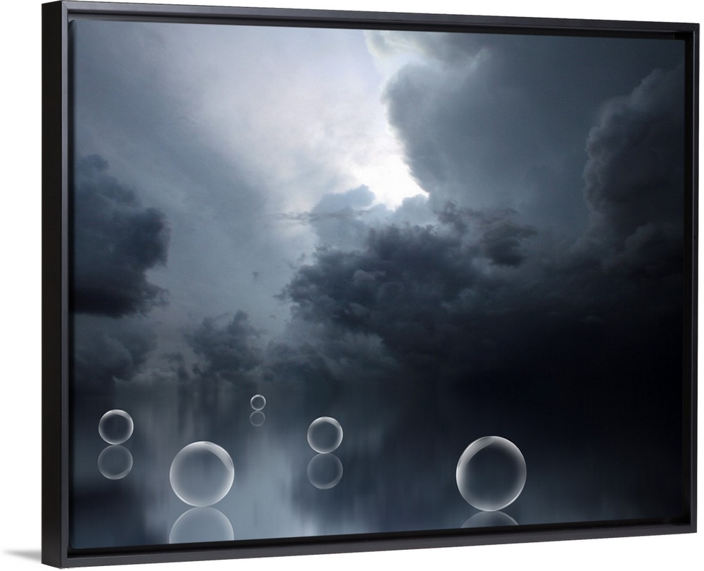 <p>Horizontal fantast artwork on a big canvas of a dark, cloudy sky above several bubbles that appear to be sitting on top of a smooth, reflective surface.</p>