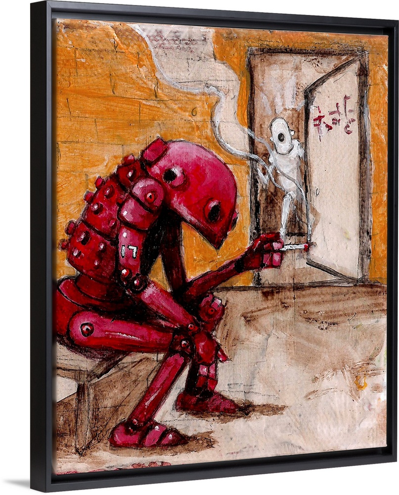 <p>Illustration of a red robot sitting on a bench and smoking.</p>