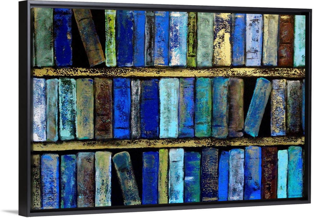 <p>Three shelves of books in varying shades of blue.</p>