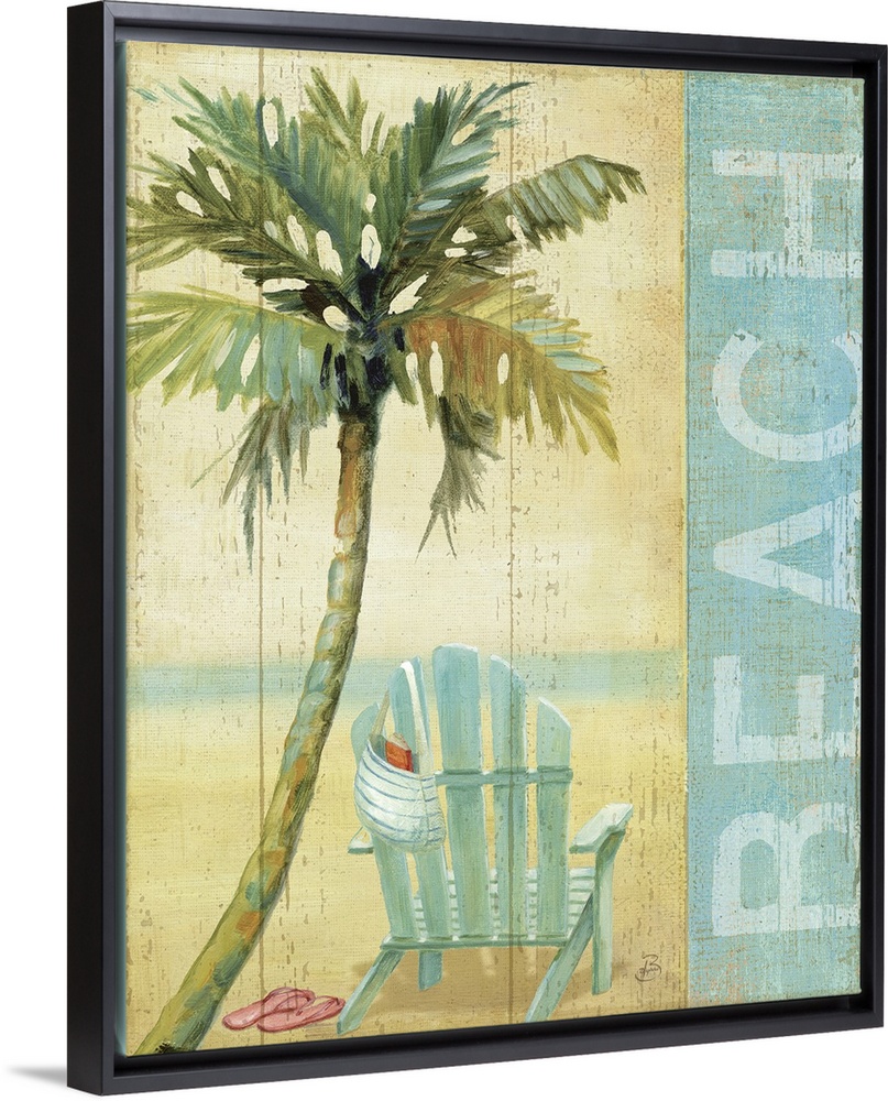 <p>The piece has a wooden panel texture with a single palm tree and beach chair that has a bag hanging off it and sandals sitting on the sand.</p>