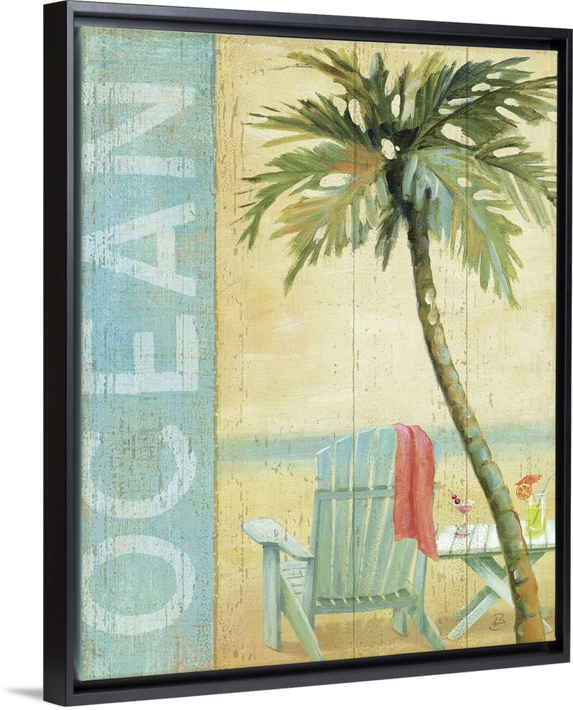 <p>Artwork of beach chair and table on the shoreline with a palm tree in the foreground. The text "Ocean" is written vertically down the left side of the image.</p>