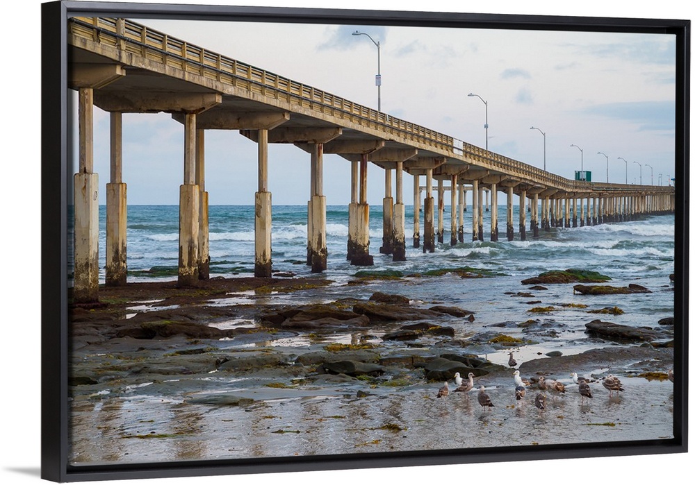 <p>Photograph of low tide reef and Ocean Beach Pier with sea gulls, California.</p>