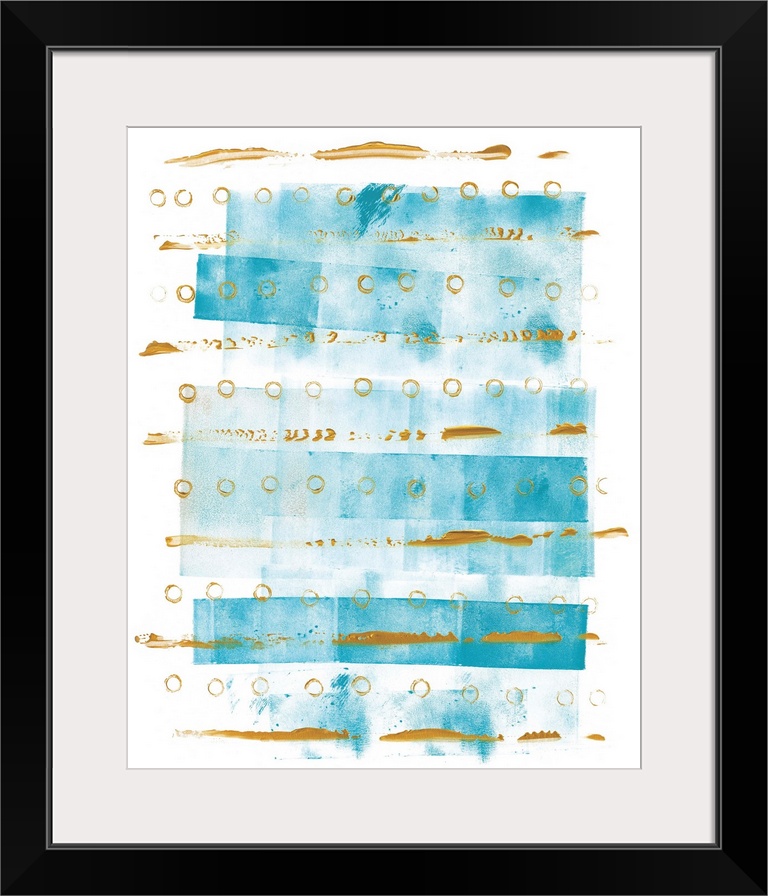 <p>Abstract watercolor painting with horizontal lines of blue rectangular boxes and metallic gold circular designs and patterns on top.</p>
