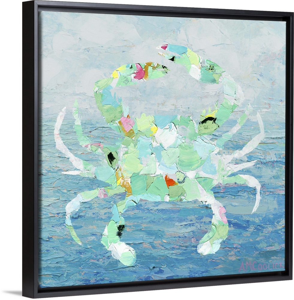 <p>Shape of a crab in mint green and white over a blue ocean.</p>