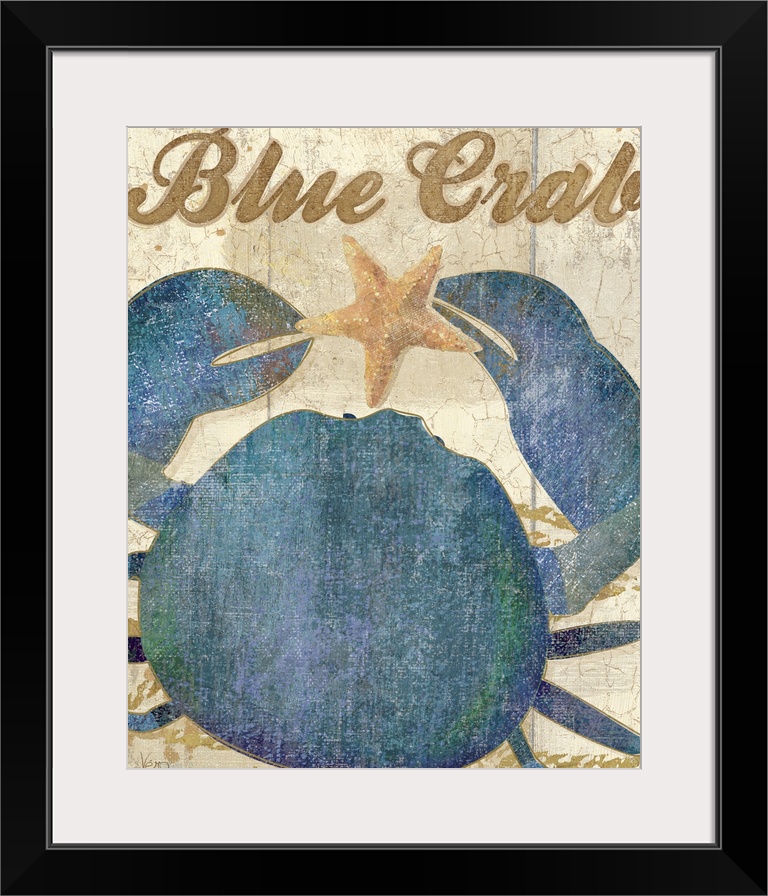 <p>A blue crab holding a starfish with the words "Blue Crab" written in script above it.</p>