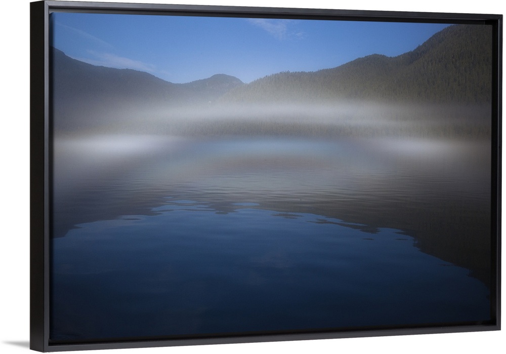 <p>Ocean fog lifting off the water at the mouth of Kynoch Inlet, Fjordland Conservancy, BC, Canada</p>
