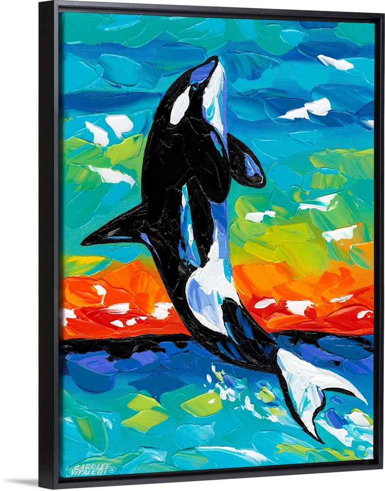 <p>Contemporary painting using vivid colors of a killer whale leaping from the water.</p>