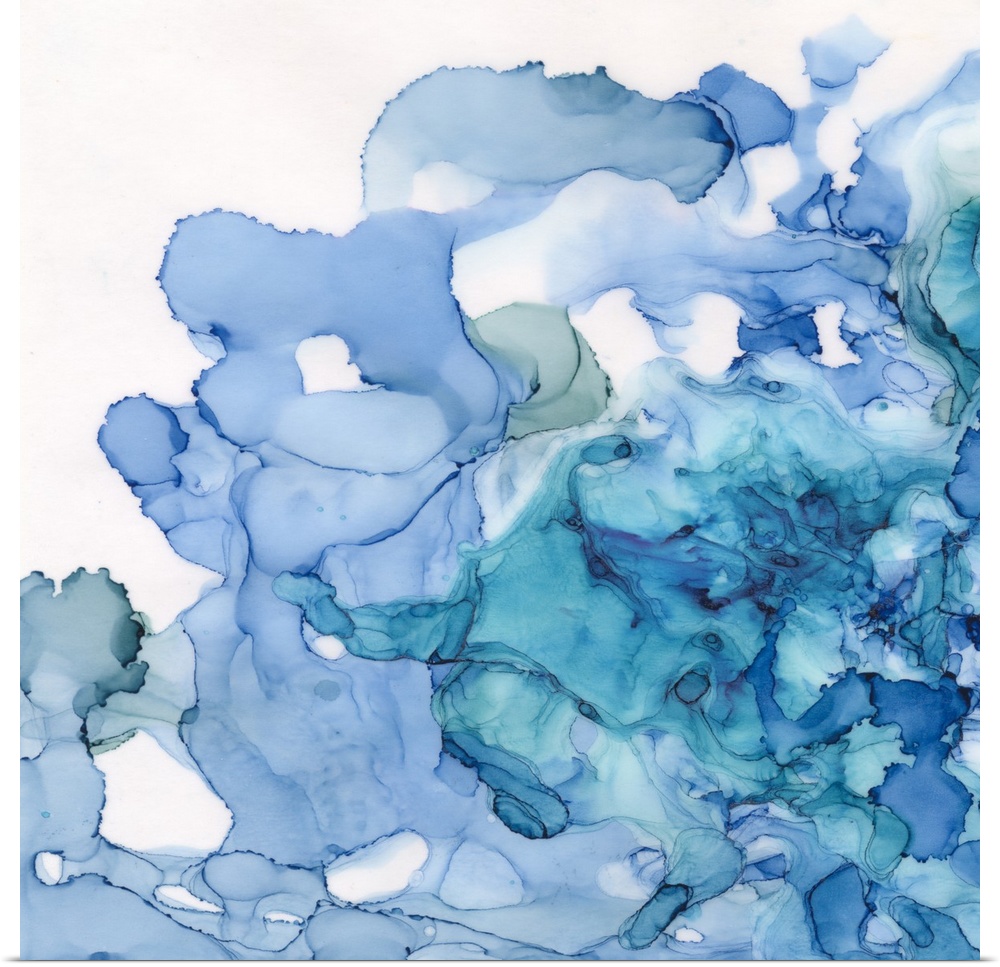 <p>Abstract watercolor painting of swirls in shades of blue.</p>