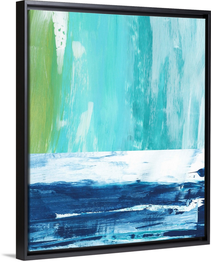 <p>Abstract landscape painting of an ocean using vertical and horizontal broad brush strokes in blue.</p>