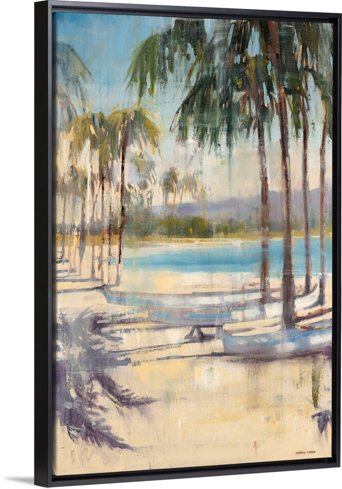 <p>Contemporary landscape painting of a tropical beach scene with tall palm trees and a few canoes with the blue ocean in the background.</p>