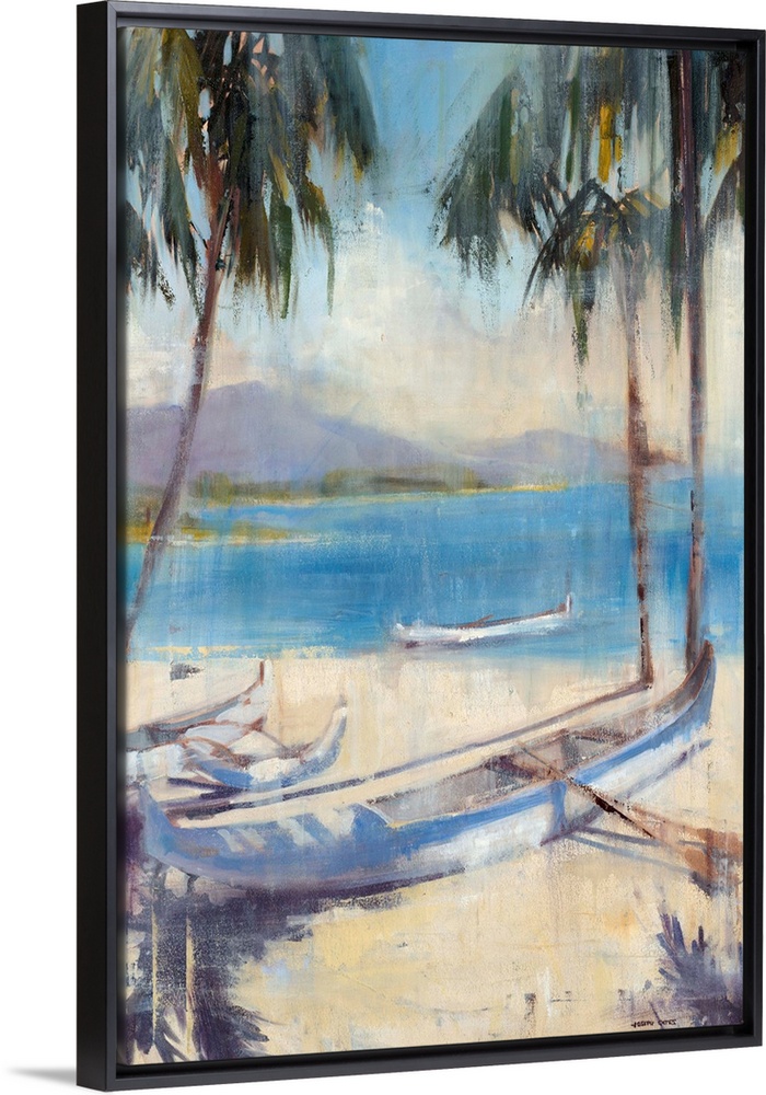 <p>Contemporary landscape painting of a tropical beach scene with tall palm trees and a few canoes with the blue ocean in the background.</p>