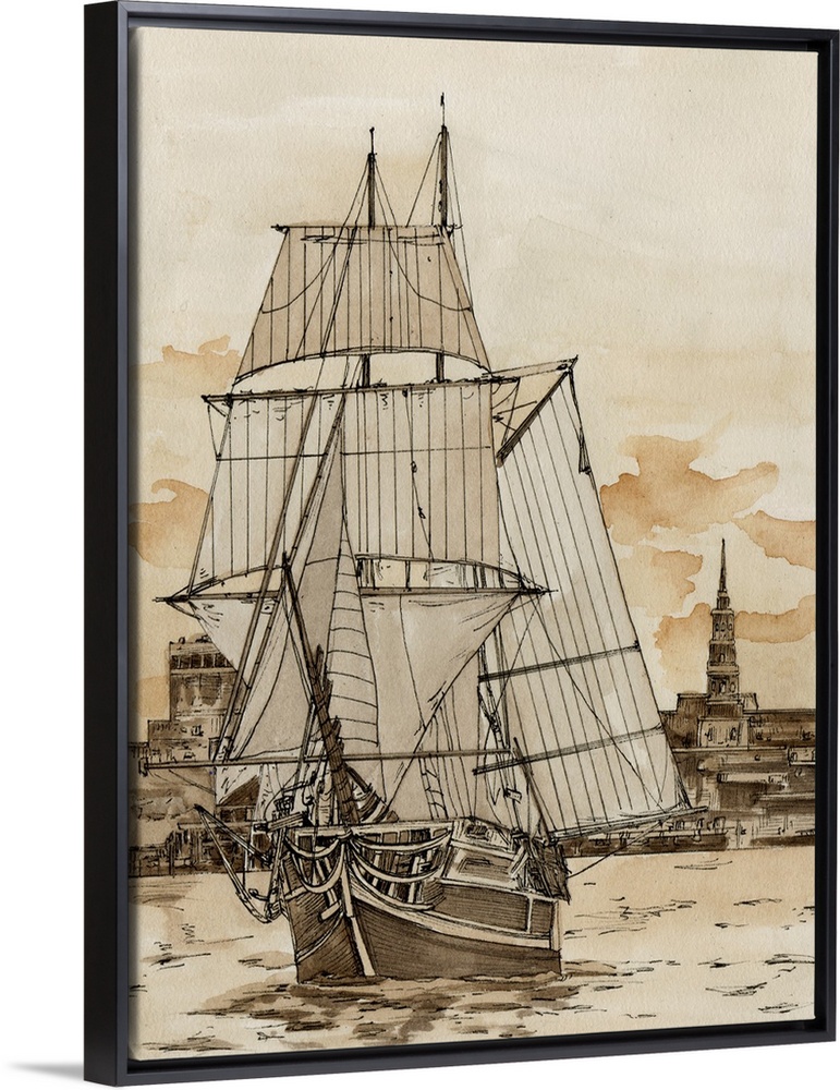 Art Coastal Brown Wall Art Decorative Art Moody Vintage Painting Transportation Boat Sailboat Melissa Wang Watercolor