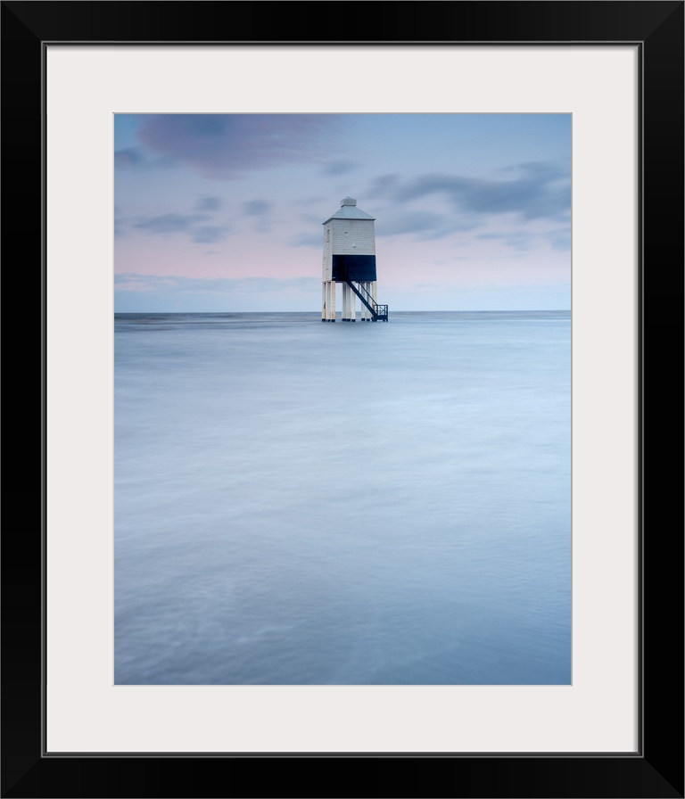 <p>A lighthouse stands guard on four strong legs in the ocean keep watch over the sea.</p>