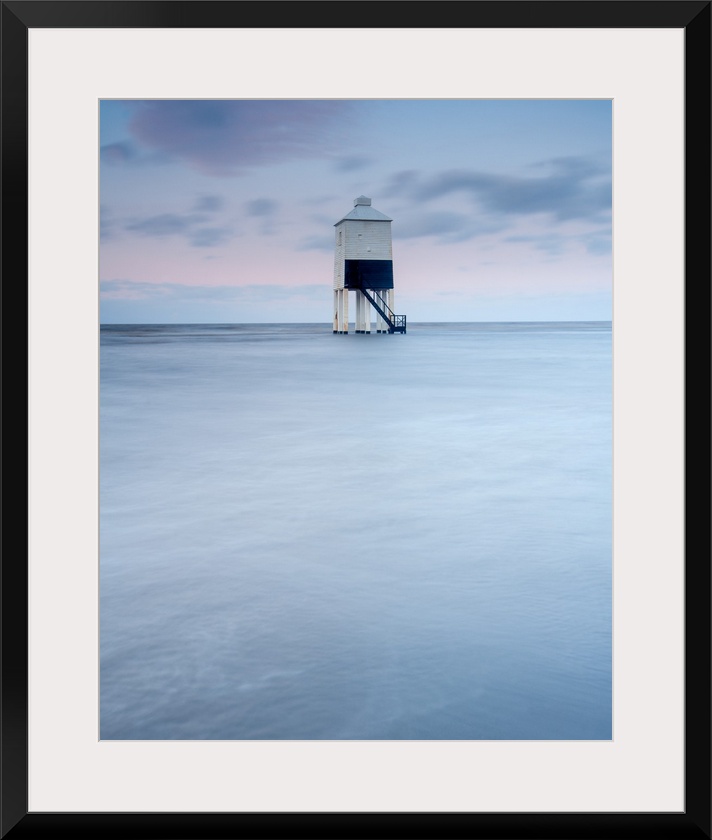 <p>A lighthouse stands guard on four strong legs in the ocean keep watch over the sea.</p>