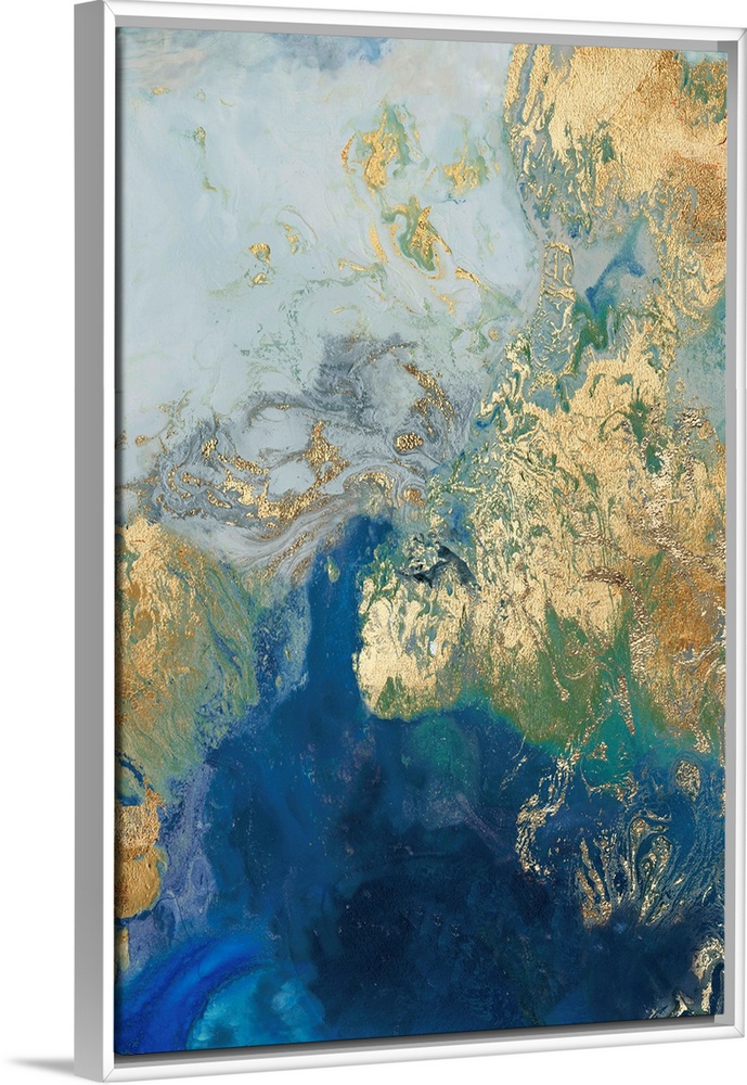<p>Abstract painting in blue and gold, resembling swirling waves.</p>