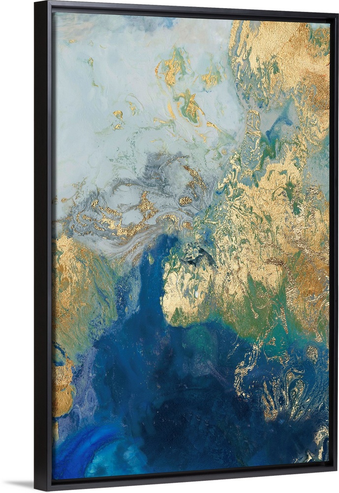 <p>Abstract painting in blue and gold, resembling swirling waves.</p>