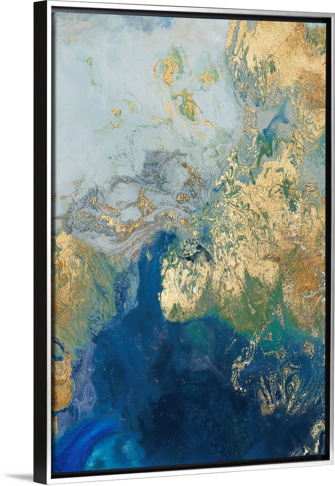 <p>Abstract painting in blue and gold, resembling swirling waves.</p>