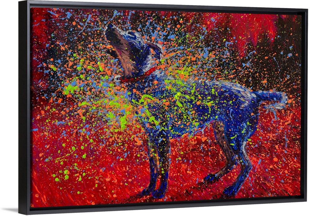 <p>Brightly colored contemporary artwork of a dog shaking off colors.</p>
