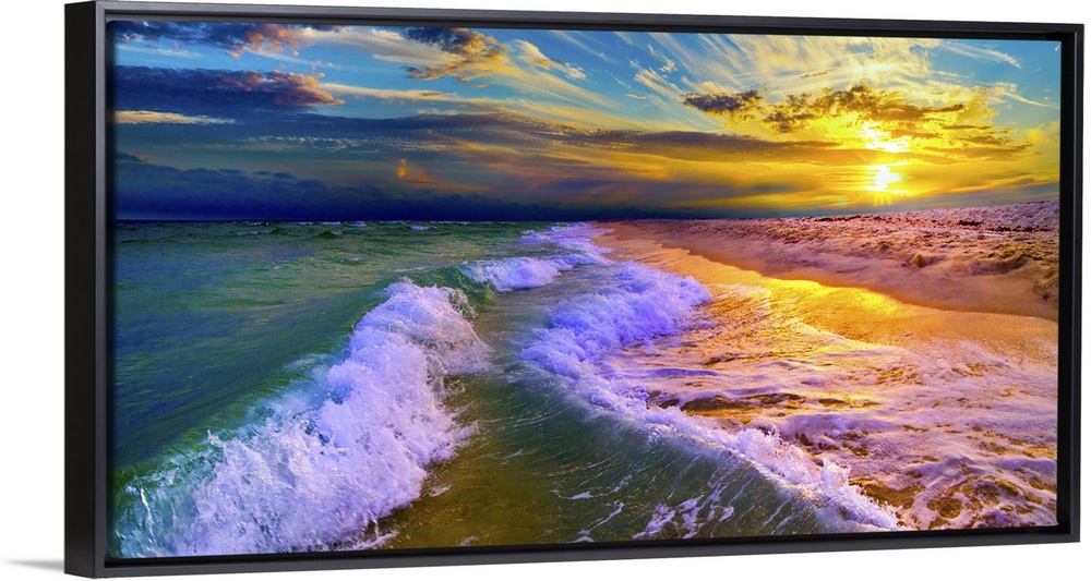 <p>Ocean waves crash on the shore in this ocean sunset panorama with amazing clouds. This features breaking waves on a beautiful sea shore.</p>