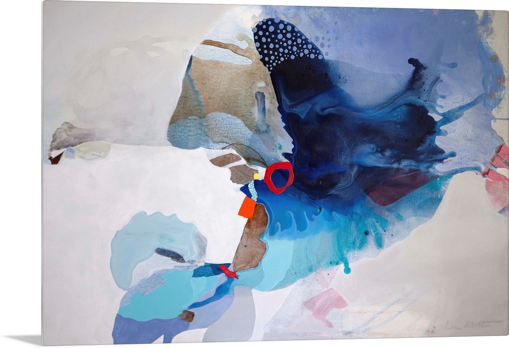 <p>Contemporary abstract painting in various blues on a light-colored background.</p>