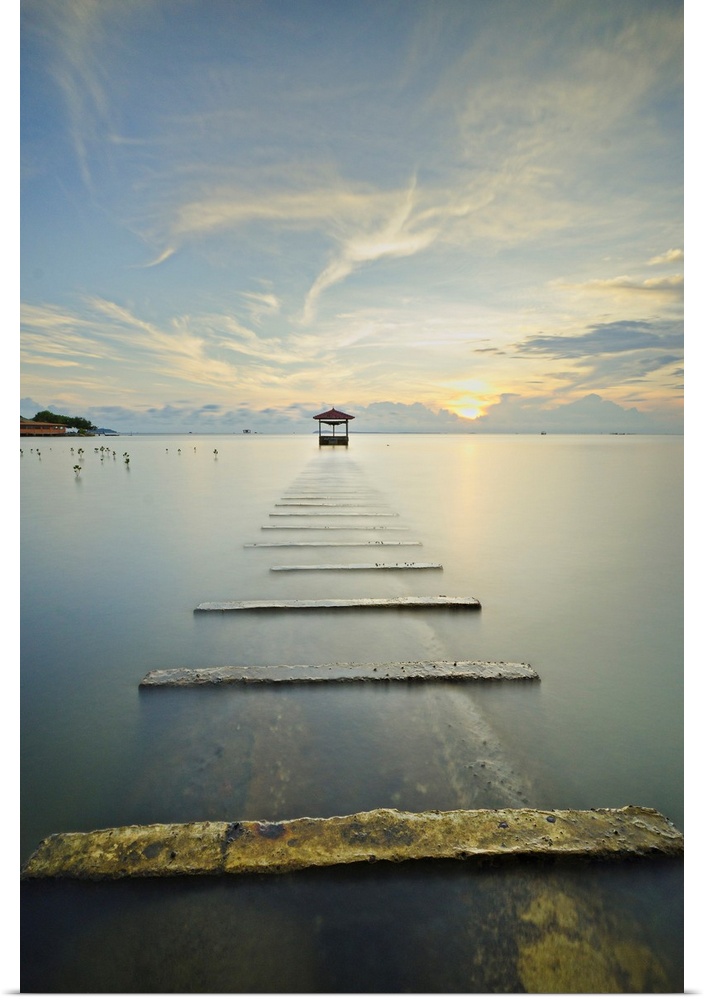 <p>Bridge underwater, in the ocean, color photograph</p>