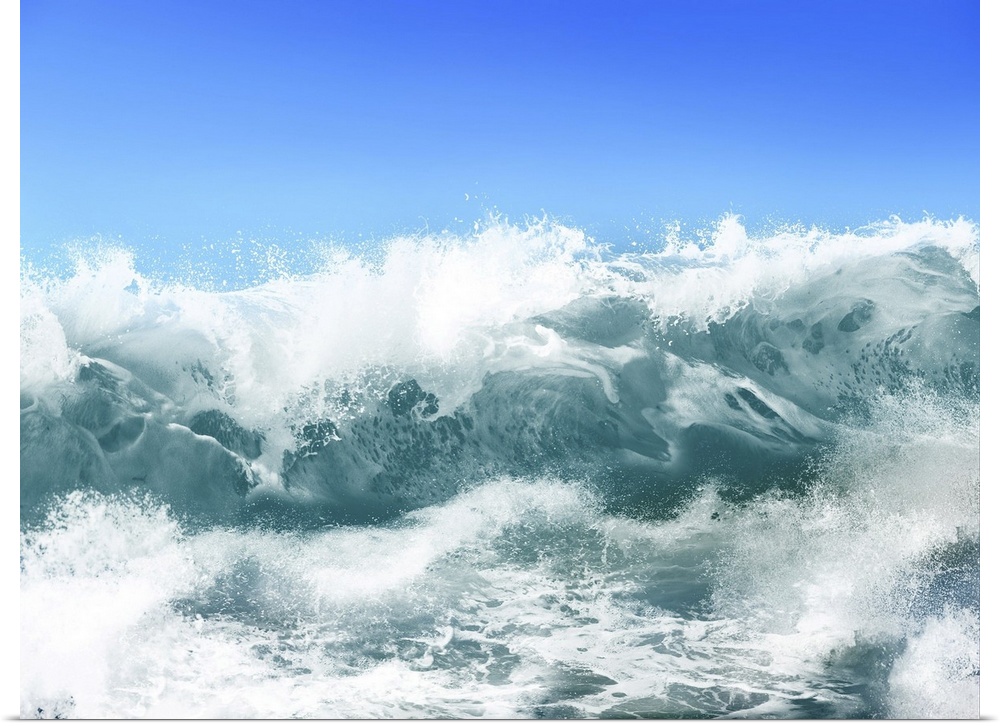 <p>White ocean waves on blue sky background - computer illustration.</p>