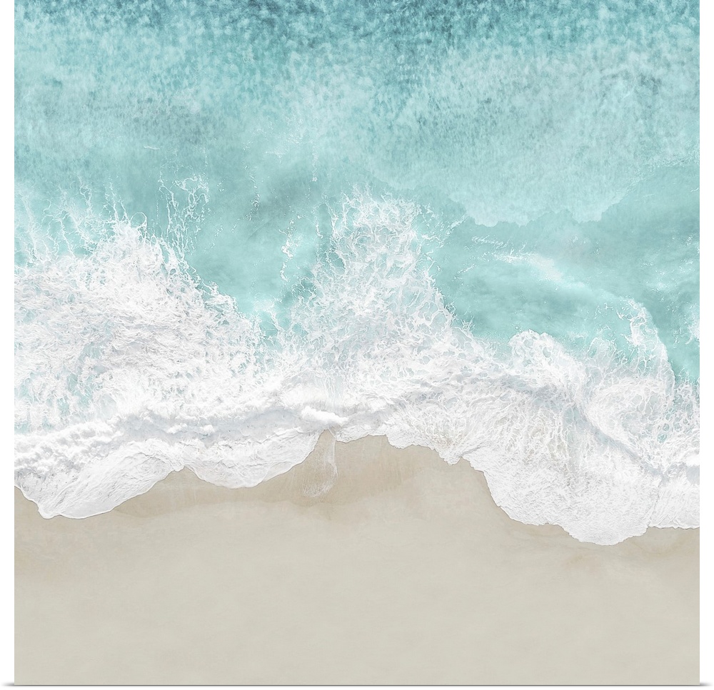 <p>One artwork in a series of aerial shots of a beach as light blue waves break upon the shore.</p>