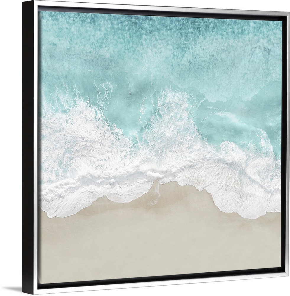 <p>One artwork in a series of aerial shots of a beach as light blue waves break upon the shore.</p>