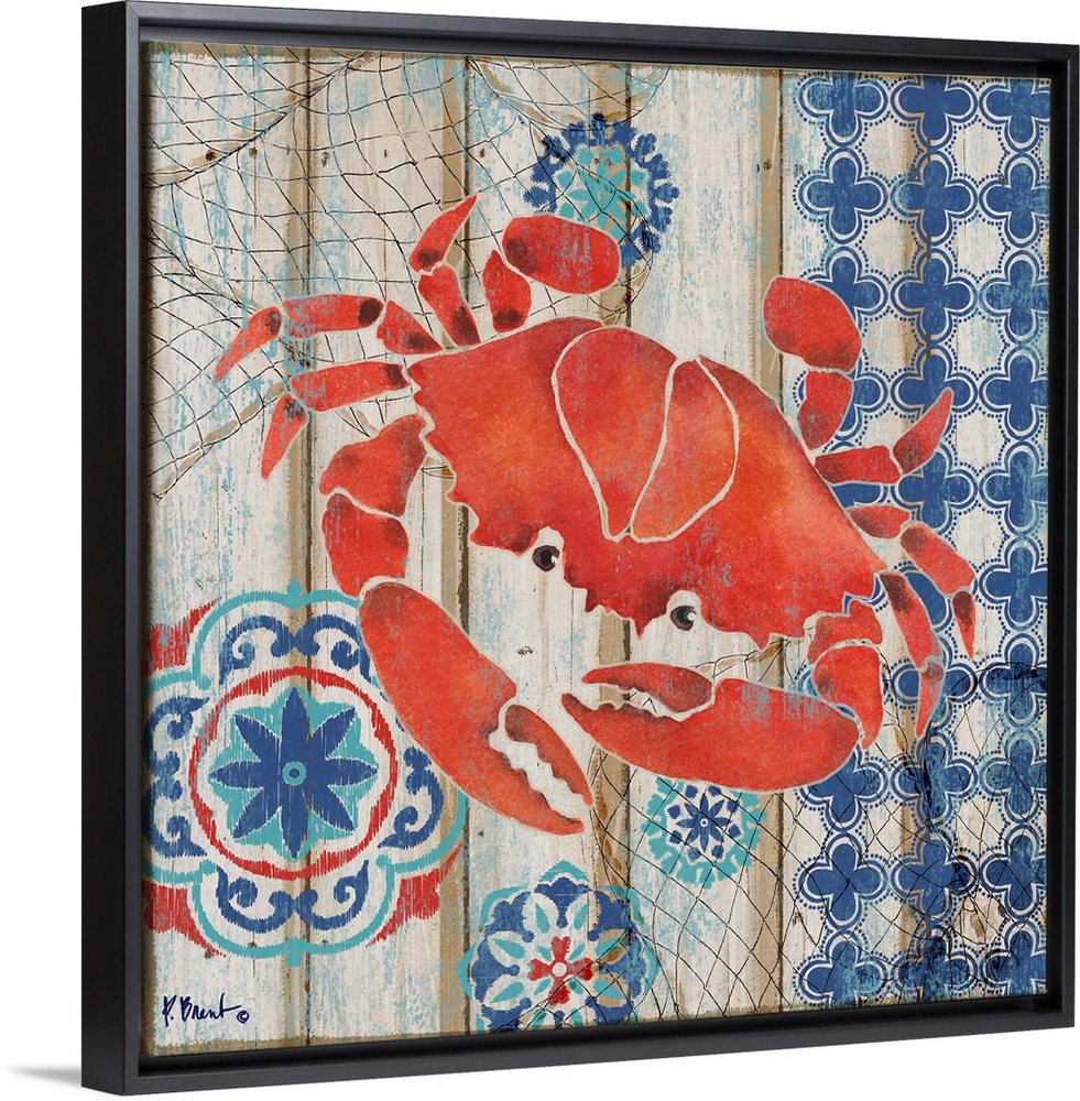 <p>Decorative artwork of a red crab on a faux wooden board background.</p>