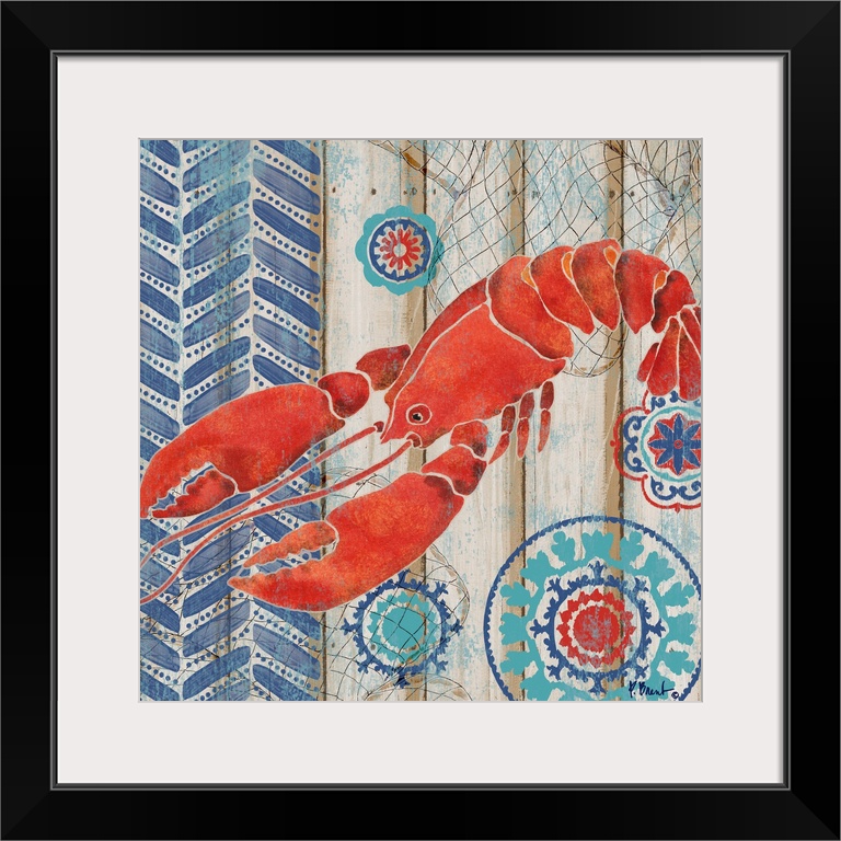 <p>Decorative artwork of a red lobster on a faux wooden board background.</p>