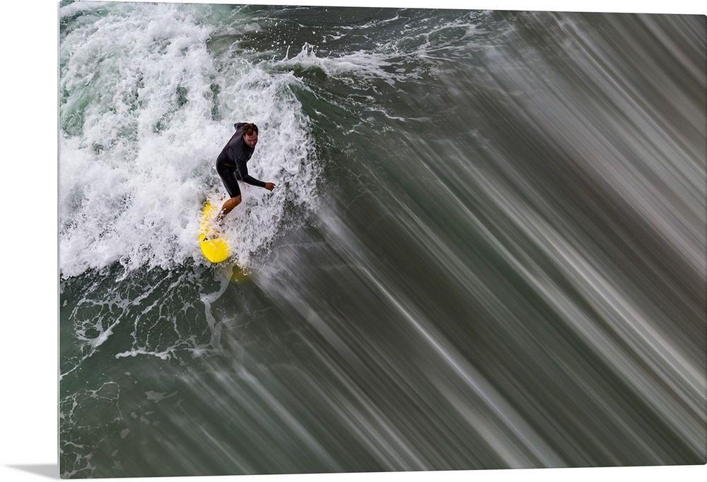 <p>Action photograph of a person surfing on a wave with a bright yellow surf board in Oceanside, California.</p>