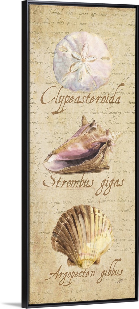 <p>Decorative design of shells on a beige background with faded text and 'Clypeasteroida, Strombus gigas Argopecten gibbus'.</p>