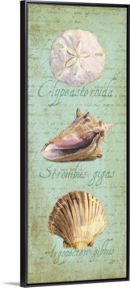 <p>Decorative design of shells on a teal background with faded text and 'Clypeasteroida, Strombus gigas Argopecten gibbus'.</p>