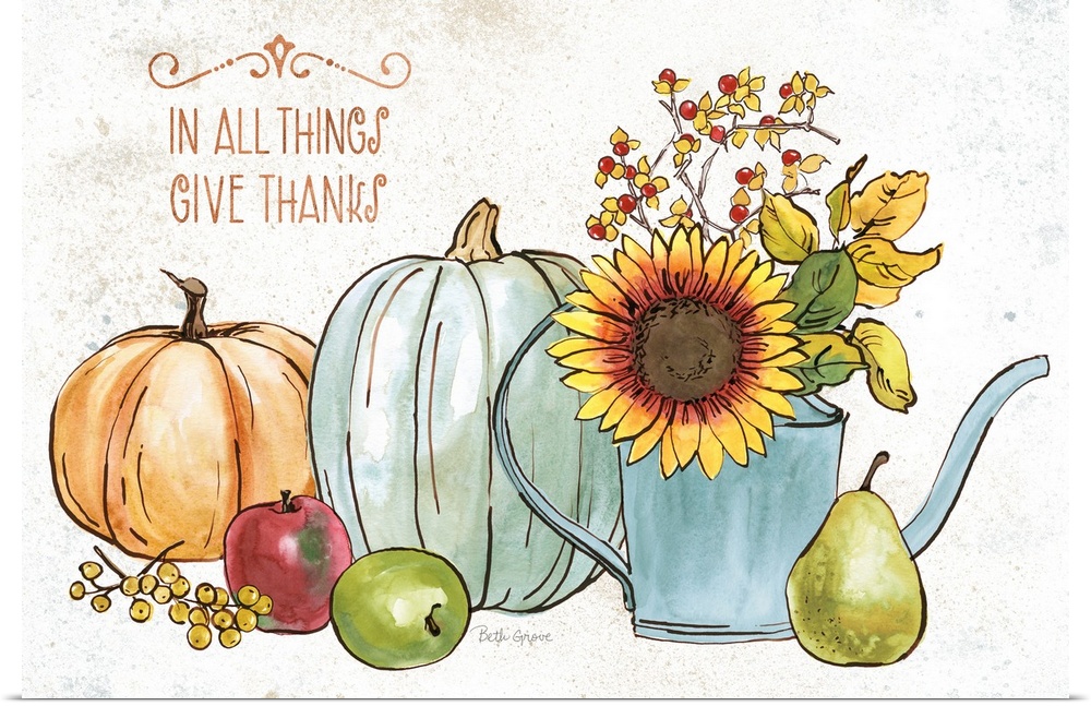 <p>Decorative artwork of autumn themed items with the words, 'In all things, give thanks'.</p>