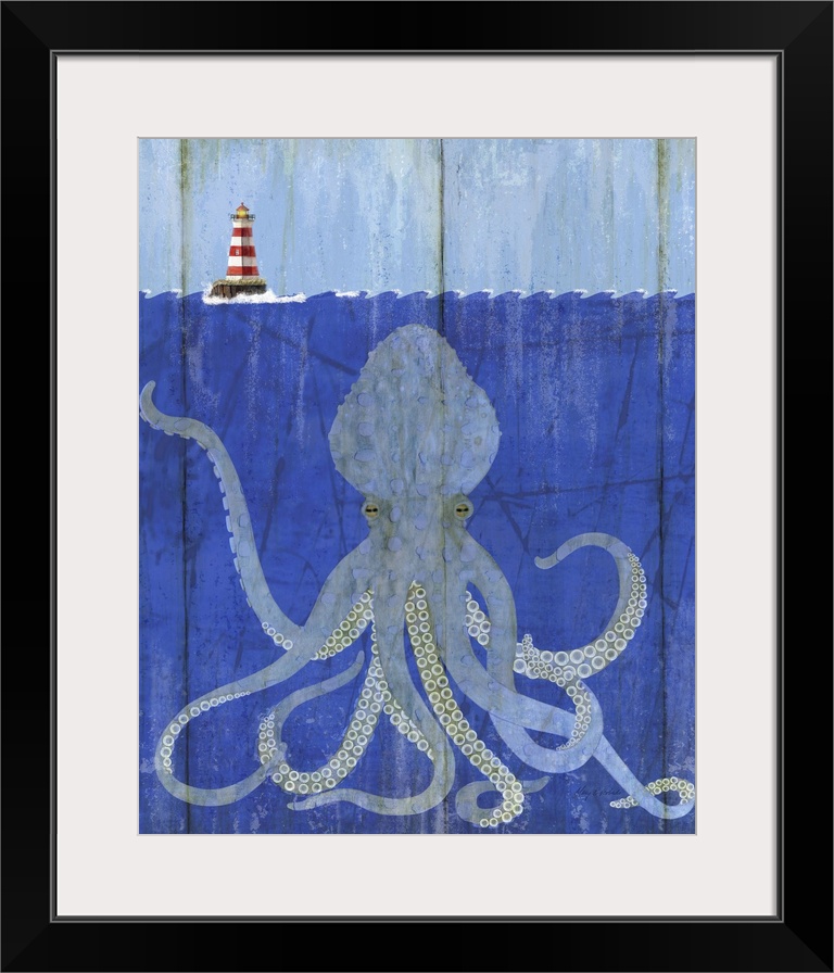 <p>Contemporary nautical painting of a cross section of an ocean scene with a giant octopus below the surface of the water.</p>