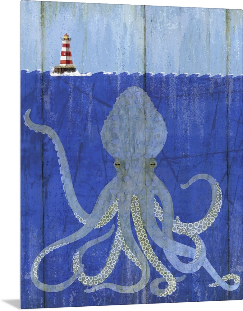 <p>Contemporary nautical painting of a cross section of an ocean scene with a giant octopus below the surface of the water.</p>