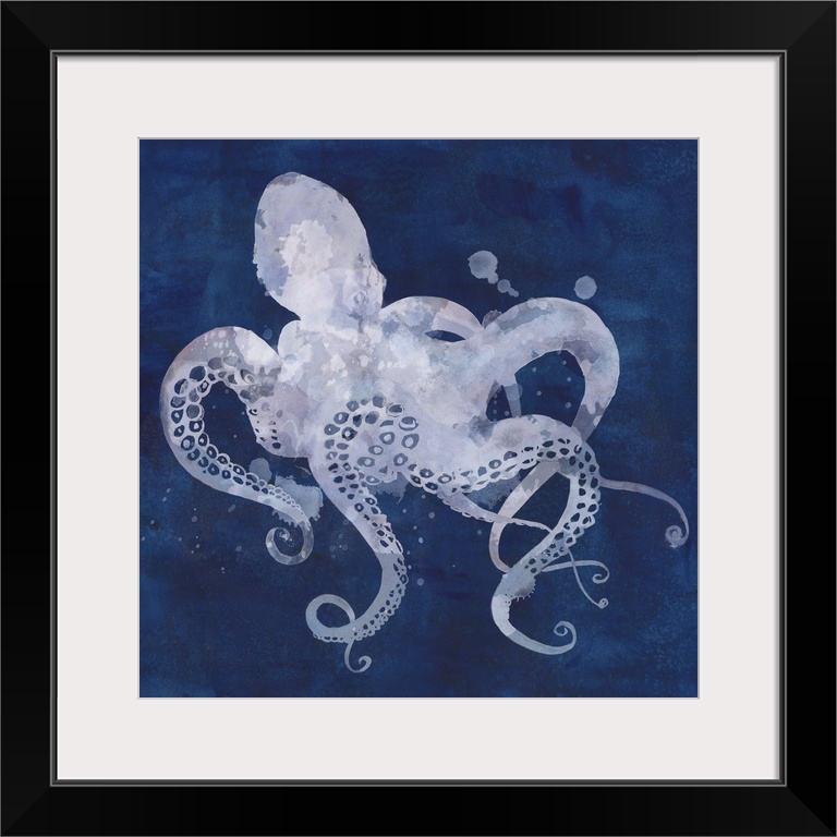 <p>Watercolor silhouette of an octopus on a dark blue background.</p>